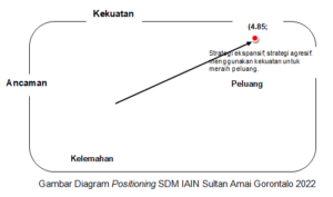 Program Studi S2 Ekonomi Syariah   IAIN Sultan Amai Gorontalo berada pada posisi kuadran 1 (positif – positif), berdasarkan analisis dengan menggunakan diagram positioning, sebagaimana disajikan pada gambar diagram dibawa. Strategi yang dipilih oleh Program Studi S2 Ekonomi Syariah  IAIN Sultan Amai Gorontalo adalah ekspansif dan agresif dengan menggunakan kekuatan untuk meraih peluang. Kekuatan yang dimiliki Program Studi S2 Ekonomi Syariah   IAIN Sultan Amai Gorontalo dapat digunakan untuk memanfaatkan peluang dan menghadapi ancaman yang ada pada lingkungan eksternal Program Studi S2 Ekonomi Syariah   IAIN Sultan Amai Gorontalo. Hal ini  memungkinkan IAIN Sultan Amai untuk menerapkan strategi perluasan dan pengembangan institusi melalui berbagai bentuk program kegiatan yang mengarah pada pengembangan institusi sehingga sejalan dengan program institut yang sedang menuju perguruan tinggi berdaya saing nasional dan internasional.