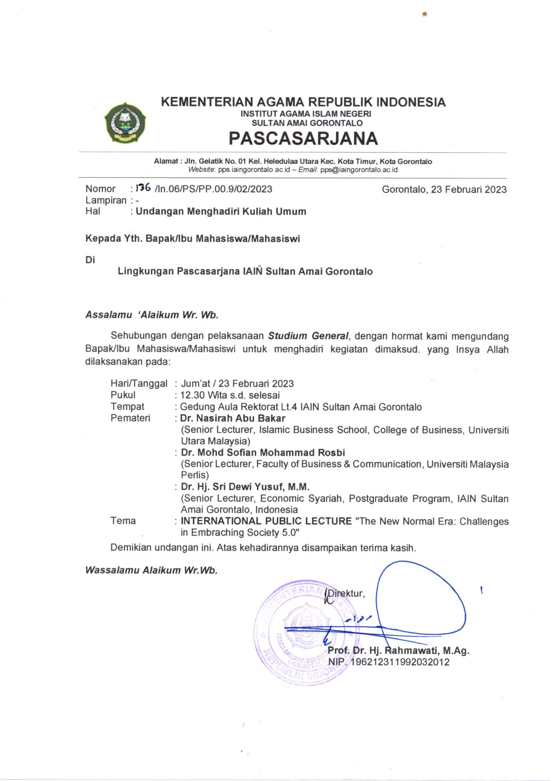 Menindaklanjuti undangan Ibu Direktur, dengan hormat kami mengundang Bpk/Ibu Mahasiswa berkenan menghadiri kuliah umum tersebut.